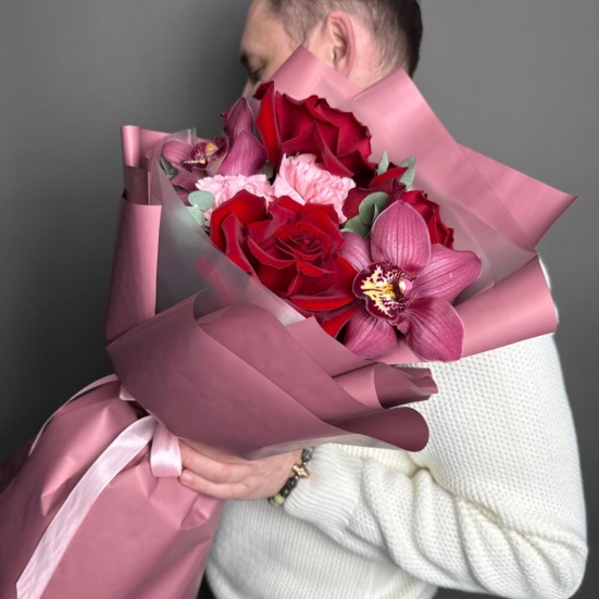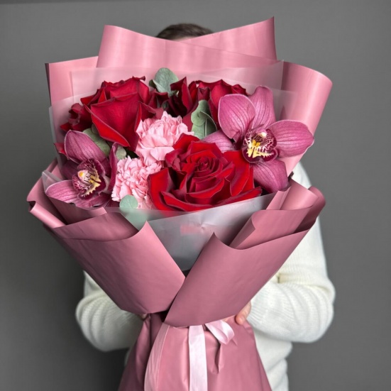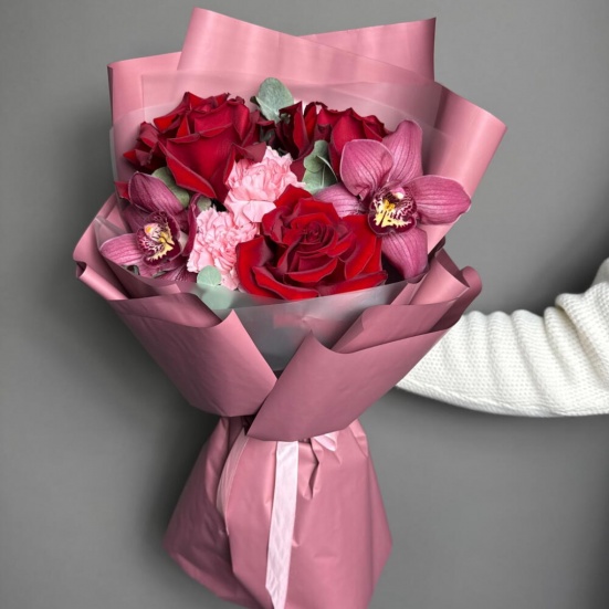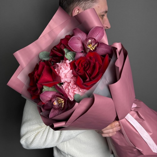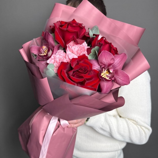 Букет из 3 красных роз, орхидей и диантуса в Бердске
